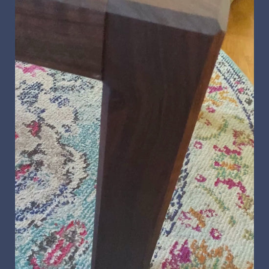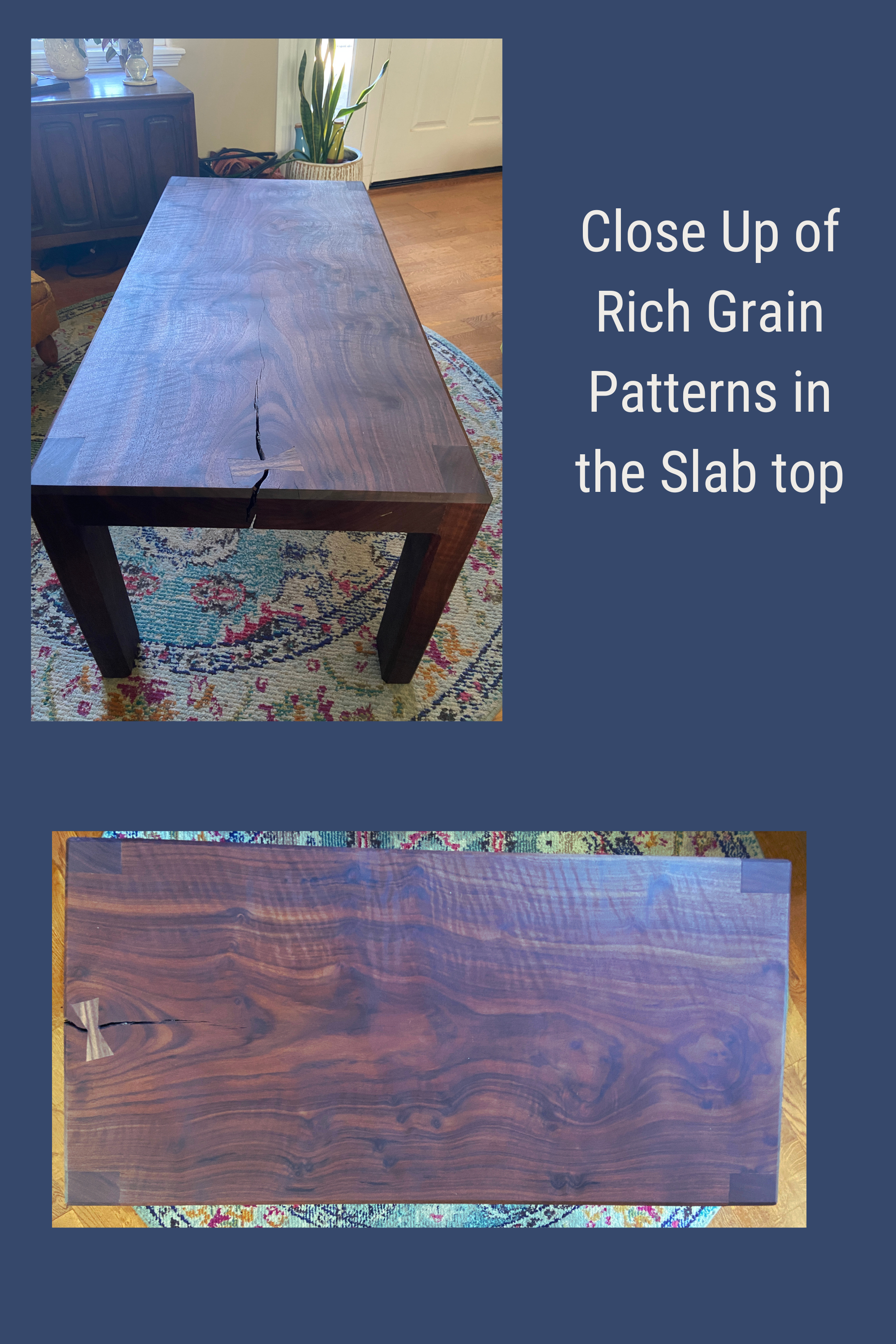 This handcrafted black walnut coffee table highlights the natural beauty and character of solid wood, featuring rich grain, natural pinholes, and a bow tie inlay designed to stabilize the slab.